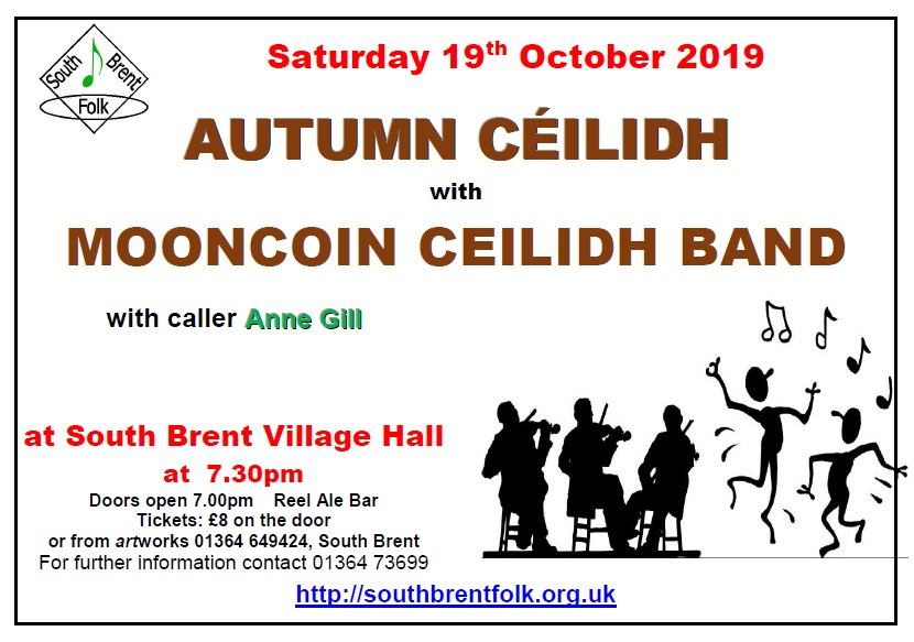 Saturday 19 October 2019: Autumn Céilidh with The Mooncoin Ceilidh Band in South Brent Village Hall at 7.30pm (doors open 7.00pm). Dance into the longer nights with Anne Gill (caller); Steve Gill (melodeons); Sophia Colkin (fiddle); Nick Scott (Uillean pipes/Bodhran), Andy Clarke (guitar/bouzouki) - all welcome: Reel Ale bar and nibbles available. Tickets on the door or from artworks at £8.00. FFI contact Eileen on 01364 73699 or email This email address is being protected from spambots. You need JavaScript enabled to view it. or visit website.
