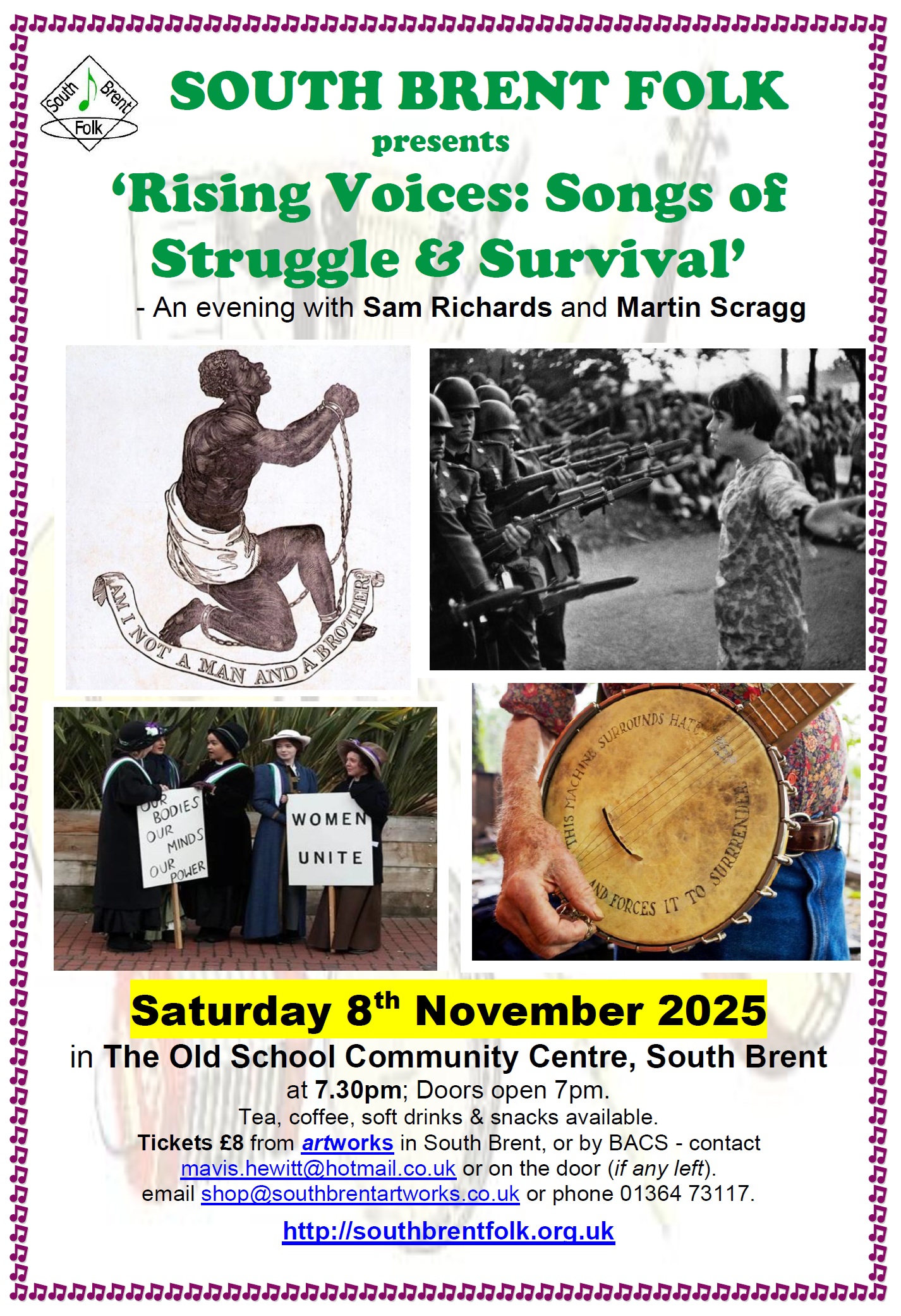 Saturday 8 November 2025: ‘Rising Voices: Songs of Struggle and Survival’ at 7.30pm (doors open 7pm) in the Old School Community Centre. Following their previous successful autumn evenings Devon musician and folk song expert Sam Richards, and singer-songwriter-guitarist, Martin Scragg, present songs, stories and verses inspired by struggle and survival . Organised by South Brent Folk. Tickets £8 from artworks in South Brent, or by BACS - contact This email address is being protected from spambots. You need JavaScript enabled to view it. or on the door (if any left). See: http://southbrentfolk.org.uk/ and Facebook.