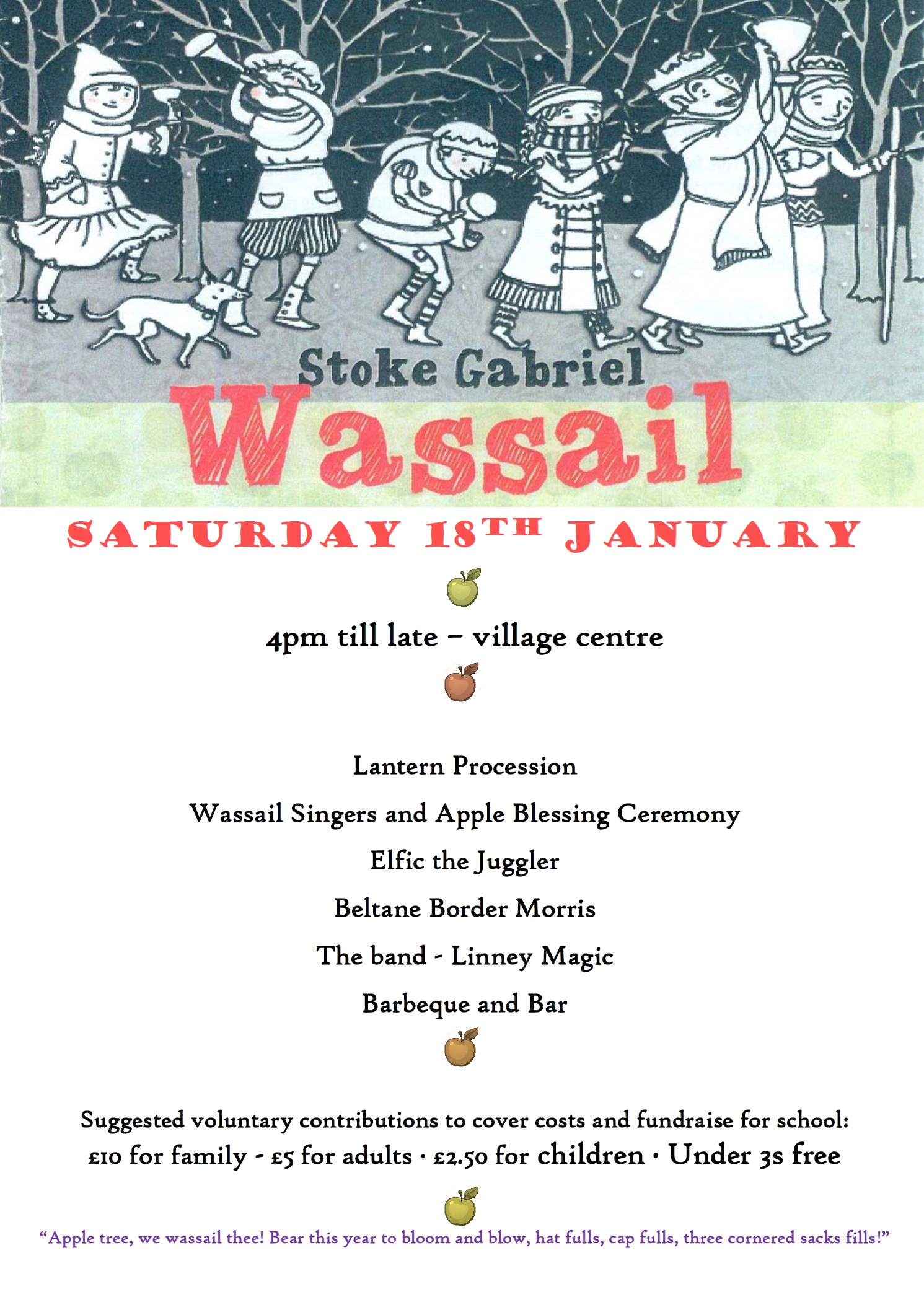 Saturday 18 January 2025: The 30th Annual Stoke Gabriel Wassail. A magical evening of ‘Cider, Culture & Cheer’ organised as a fundraiser by the ‘Friends of Stoke Gabriel School’ (FOSS), the Annual Wassail is a very popular event. Apple Wassailing is a revived, ancient tradition performed in many villages around 'Old Twelfth Night' to bless the cider apples and orchards and encourage a good crop in the coming year. Entertainment will include The Lantern Procession, Beltane Border Morris; Elfic the Juggler; The South Devon Wassail Singers and the band, Linney Magic. Entry: Suggested voluntary contributions to cover costs and fundraise the School: Family: £10; Adults £5; Children: £2.50; Under 3s: free. See: www.facebook.com/stokegabrielwassail.