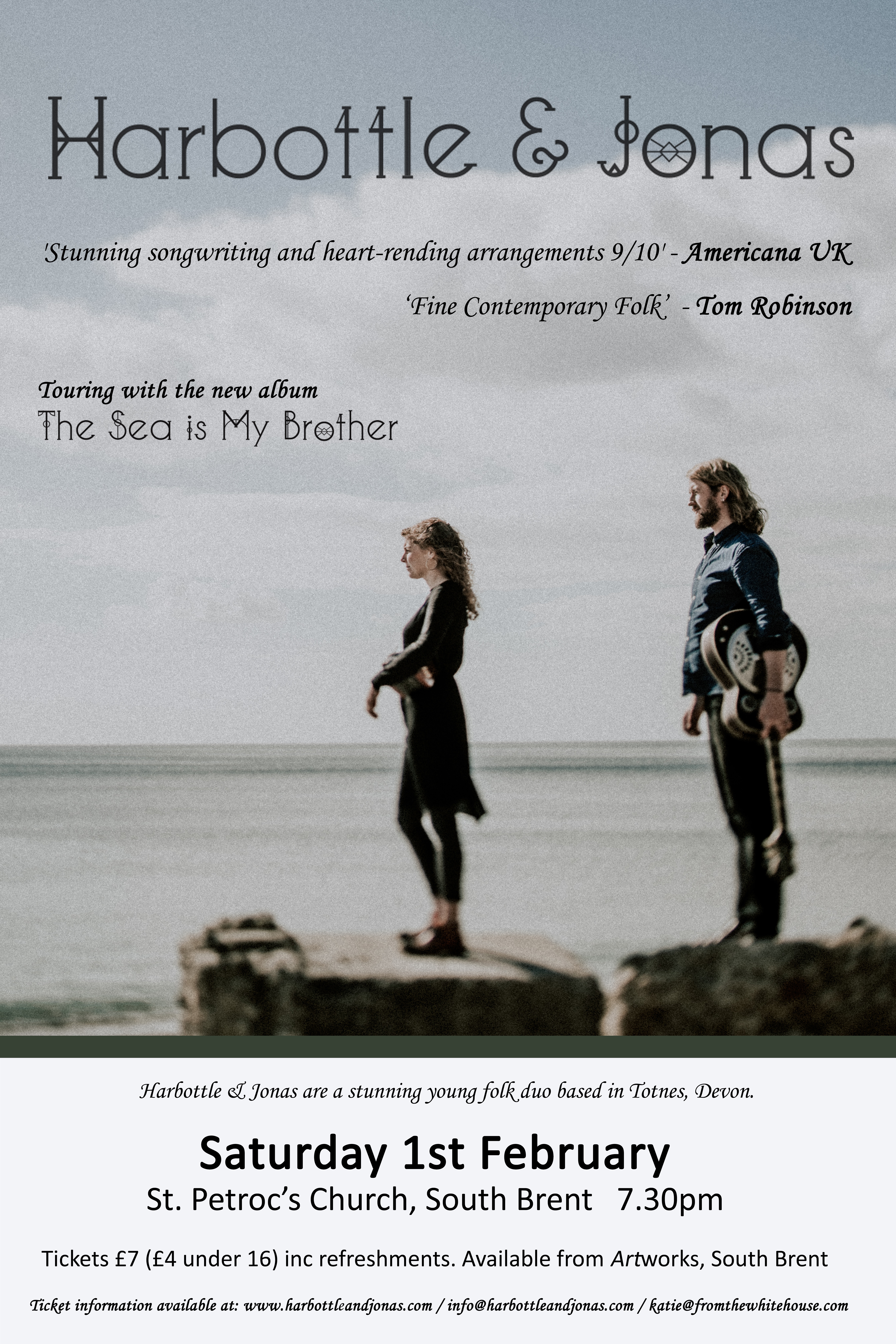 Saturday 1 February 2020: Concert with Harbottle & Jonas at 7.30pm in St Petroc’s Church. Dave Harbottle and Freya Jonas are a husband and wife duo who combine the rich traditions of folk music with original songwriting and contemporary interpretations through a blend of closely intertwined vocal harmonies and compelling and authentic musical arrangements, blending concertina, harmonium, banjo, cittern, stomp box and acoustic guitar. Having become national names on the folk scene, they are now South Brent residents. They will be playing on this occasion as a trio, with Annie Baylis-Gray bringing an extra dimension with beautiful vocal harmonies and fiddle playing. St Petroc’s Church is delighted to host this concert in aid of church funds and features in the duo’s latest music video recorded in the church. Tickets at £7 /£5 will be available from artworks in South Brent, or from Guy and Cathie Pannell. See: www.harbottleandjonas.com/.
