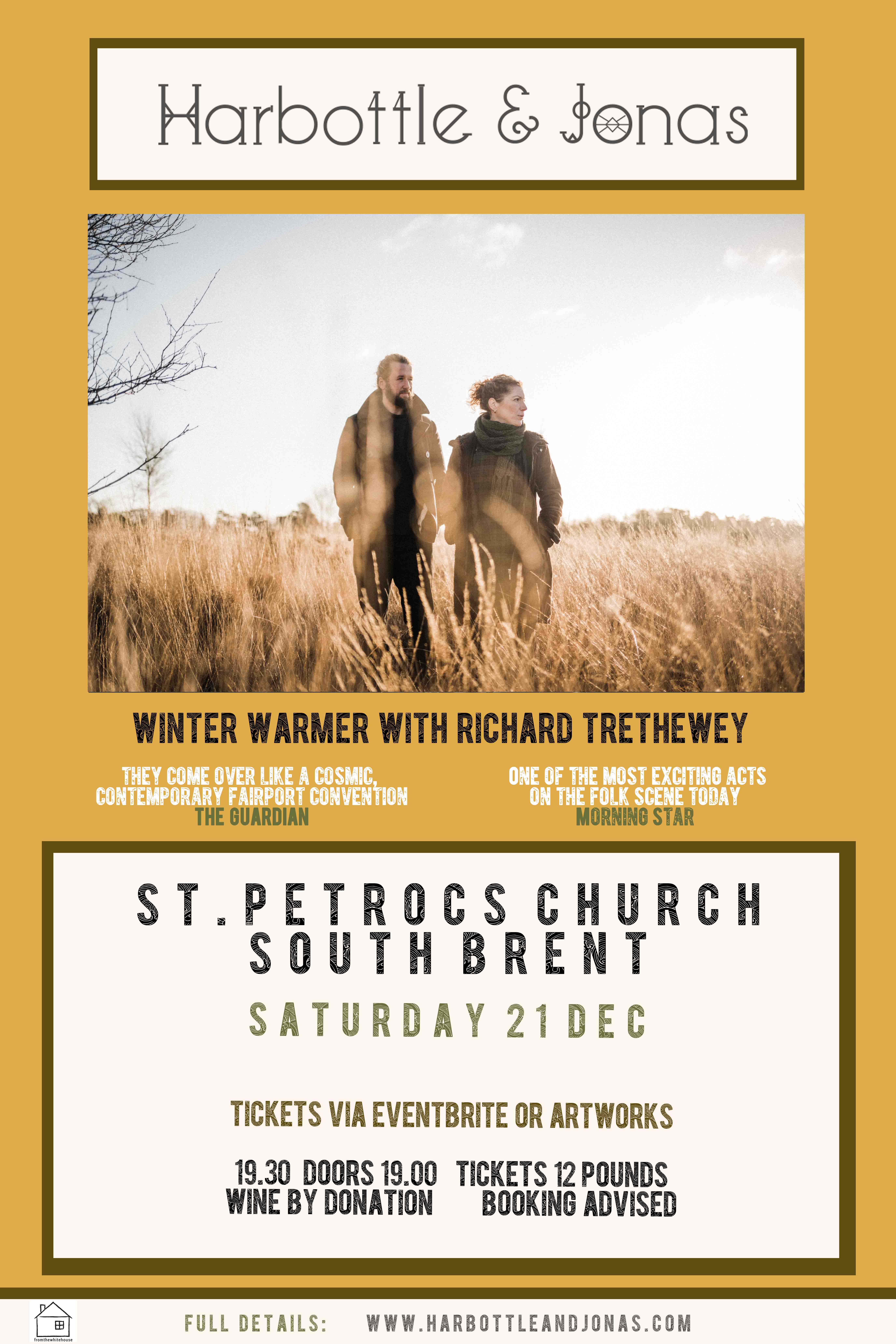 Harbottle & Jonas' Winter Warmer with Richard Trethewey in St Petroc's Church, South Brent at 7.30pm (doors open 7.00). Dave and Freya return to St Petroc’s, for another winter concert in their home village. Come and join them at St. Petroc's, for a rare evening of winter songs, harmonies and carols. Partners in life and music, dynamic Devon based folk duo Harbottle & Jonas are one of the most exciting acts on the UK circuit today, combining a love of the richness of traditional folk with their own original and powerful songwriting. Dave and Freya have developed a distinct and compelling signature sound, blending concertina, harmonium, cittern, stomp box, acoustic guitar and banjo with their beautiful and closely intertwined vocal harmonies. Richard Trethewey grew up in Cornwall surrounded by music and developed a keen interest in the traditional music that tells the story of the remarkable history and people of this place. Wine by donation. Booking advised - tickets at £12 in advance from artworks or on line (plus fee) via www.eventbrite.co.uk/e/winter-warmer-harbottle-jonas-richard-trethewey-st-petrocs-church-south-brent-tickets-1048765916087. See: www.harbottleandjonas.com/ and www.richardtrethewey.org/ and Facebook.