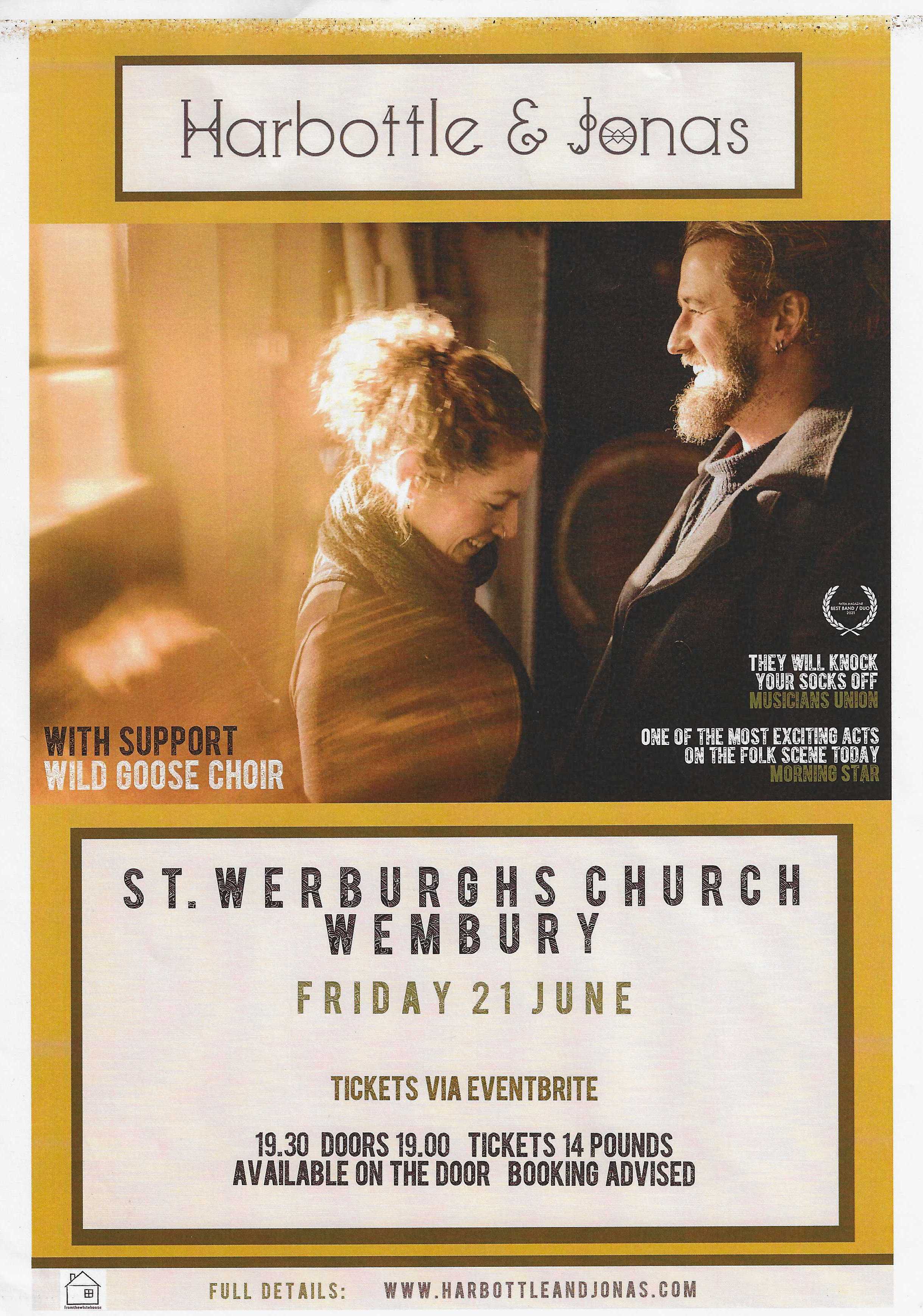 Saturday 21 June 2024: Harbottle & Jonas at 7.30pm (doors open 7pm) in St Werburgh's Church, Wembury with support from Freya’s Wild Goose Choir. South Brent based Dave and Freya combine a love of the richness of traditional folk with their own original, powerful songwriting and have established themselves as one of the finest duos on the folk circuit today, blending concertina, harmonium, shruti box, banjo, stomp box, acoustic guitar, piano and cittern with their powerful close vocal harmonies. Tickets at £14 via www.eventbrite.co.uk/e/harbottle-and-jonas-at-st-werburghs-church-wembury-tickets-876633373017. See: www.harbottleandjonas.com/ and Facebook