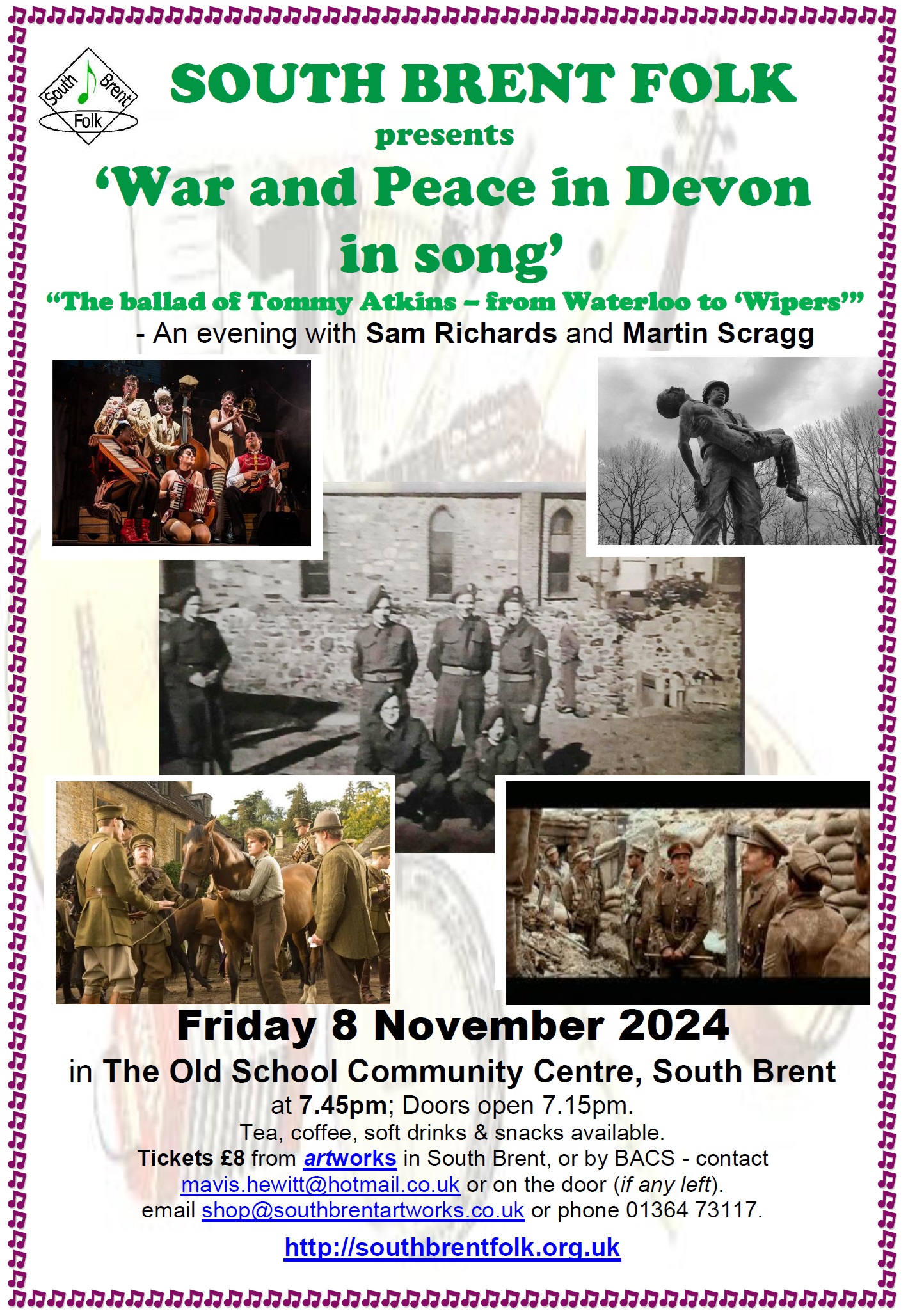 Friday 8 November 2024: ‘The ballad of Tommy Atkins – from Waterloo to ‘Wipers’: War and Peace in Song in Devon’ at 7.45pm (doors open 7.15pm) in the South Brent Old School Community Centre, .